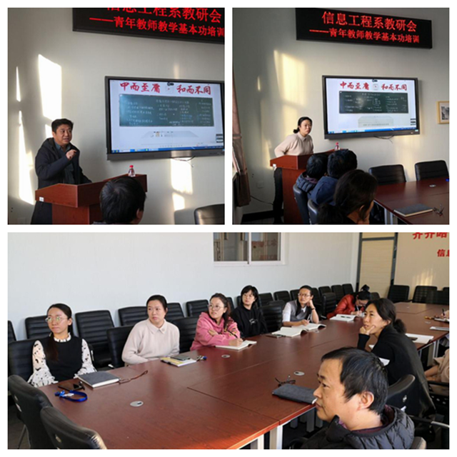 12月18日下午,信息工程系召开教研会,由系主任武传宝、教学工作副主任刘春媛与系二级督导王智慧、姚旭、洪学银老师,针对各位青年教师的板书设计内容提出指导意见和建议,强调对实验课程,板书内容可提前准备好,更直观地向学生展示实验的目的、实验步骤和实验内容;对理论课程,板书内容要做到随写随讲,列出图形、图表,并可采用辅助性教学手段。