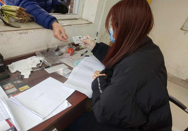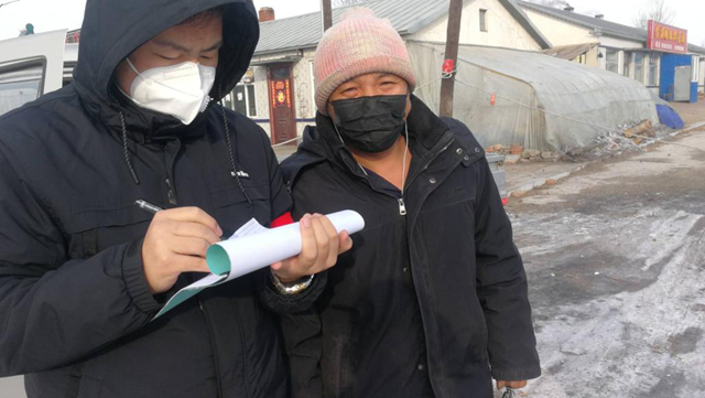 工管171班团支书刘美辛在黑龙江省海伦市参加疫情防控志愿服务工作,针对外出人员进行登记排查。