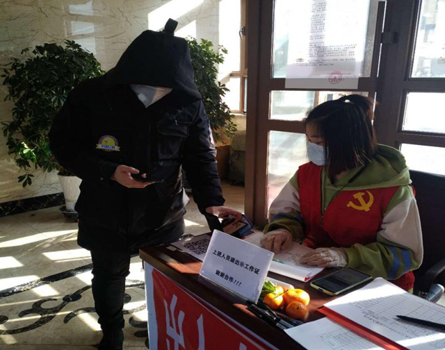 土木191班团员耿闯在哈尔滨市双城区做疫情防控志愿者,主要工作是对来往人员进行信息登记。
