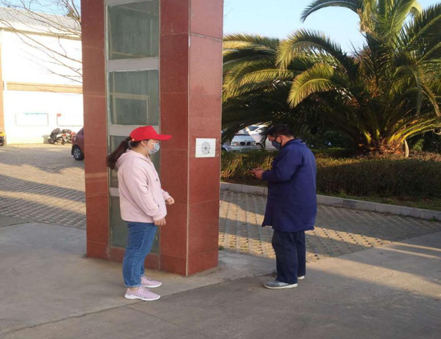 土木192班团员李珊在齐齐哈尔市克东县做疫情防控志愿者,在小区卡点为居民登记测量体温,并发放居民通行证,每天工作时间达5个小时。