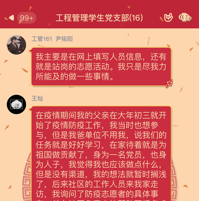 3月6日,工程管理专业学生党支部通过qq群组织“抗‘疫’征途,党旗飘飘”主题党日活动。支部全体党员学习了我校附属建华医院20名援鄂医护人员的事迹以及我校师生在疫情防控中参加志愿服务的典型事例,纷纷畅谈自己学习感悟。学生党员尹铭阳、王灿作为疫情防控志愿者,与大家交流分享了参加志愿服务的收获。