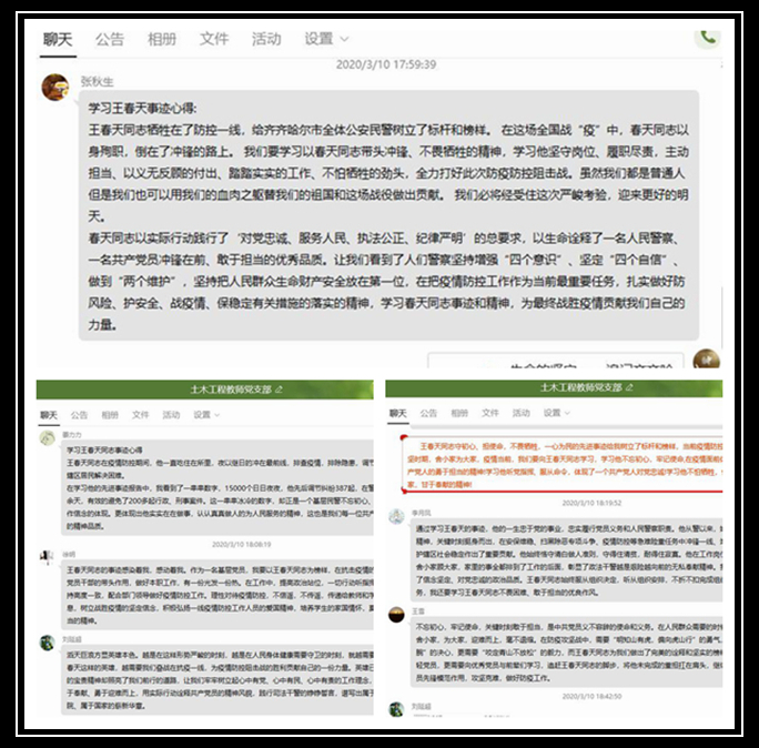 3月13日,思政教学部党支部在主题党日活动中组织全体党员在线观看《追记齐齐哈尔市公安局铁锋分局牺牲民警王春天》的视频,学习王春天同志的先进事迹。新冠肺炎疫情防控期间,齐市公安局铁锋分局新工地派出所副所长王春天,因劳累过度,倒在了疫情防控一线。王春天同志的事迹引发思政教学部党支部全体党员的热议,大家表示:要向王春天同志学习,作为一名党员教师,要不忘初心、牢记使命,全心全意为人民服务;作为一名思政教师,要磨砺政治品格,在线上教学中守好执教之责。