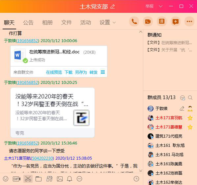 3月12日,土木工程专业学生党支部通过QQ群组织“抗‘疫’征途 党旗飘飘”主题党日活动。支部书记于敦续带领全体党员学习了习总书记有关抗击疫情的重要讲话及我市抗疫英雄王春天的事迹。张清泽等3名党员交流分享了自己参加疫情防控志愿服务的体会,全体党员分别就线上学习中如何发挥党员先锋模范作用交流了各自的思路。