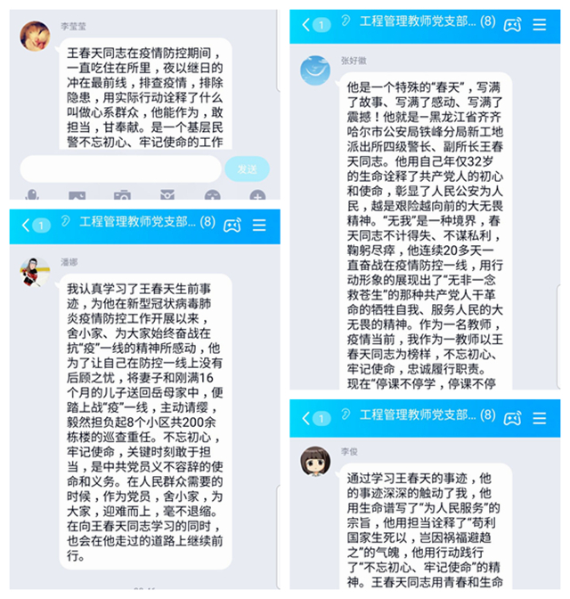 3月12日,工程管理专业教师党支部书记张好徽组织党员学习王春天先进事迹并进行网络交流,分享学习心得。大家表示,要学习王春天同志信念坚定、对党忠诚的政治品质,全心全意为人民服务,真正做到不忘初心、牢记使命,在疫情防控期间,认真上好每一堂在线教学课,注重做好学生的思想引导和学习辅导。