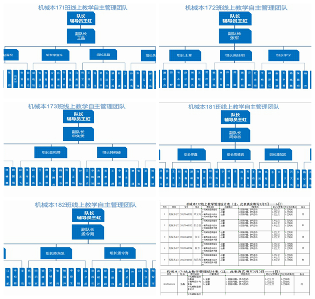 王虹老师担任在线学习自主管理团队队长,副队长分别为各班学委,下设自主管理小组。同学们有任何学习或生活上的问题,都可以第一时间通过副队长上报,及时得到反馈和解决,平时各副队长督促和提醒班级同学按时学习,班干部带领同学学习,实现班级同学共同进步,同时配合任课老师进行学生管理,提高学习效率。