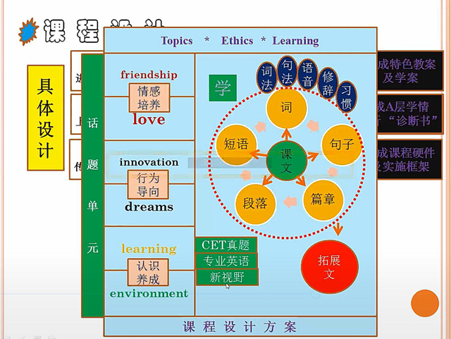 刘双丽老师的《大学英语A层》课程分享,其特点是:课程设计基于公共课特征、任务及学生最真实需求,体现“服务学生成长、服务专业需求”的宗旨;课程实施紧扣“以学生为中心”。