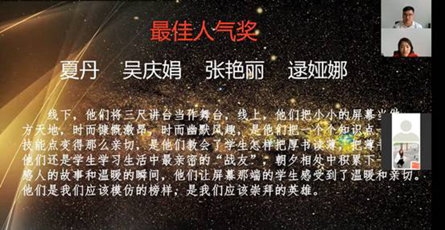 获得最佳人气奖的教师夏丹、吴庆娟、张艳丽、逯娅娜线下将三尺讲台当作舞台,线上把小小的屏幕当做一方天地。授课中,时而慷慨激昂,时而幽默风趣,把一个个知识点一个个技能点变得让学生易于接受,教会学生怎样把厚书读薄,把薄书读厚。她们还做学生学习生活中最亲密的“战友”,朝夕相处中一个个感人的故事和温暖人心的瞬间,让屏幕那端的学生感受到亲切的师德师风