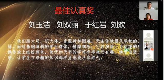 获得最佳认真奖的教师刘玉洁、刘双丽、于红岩、刘欢顾大局识大体,克服种种困难,无条件地服从教学工作安排。面对基础薄弱的学生群体,对所授课程精雕细琢巧妙演绎,赋予枯燥的理论与操作缤纷颜色,恍如天书的字符变得生动有趣,吸引学生在知识海洋里学会学习
