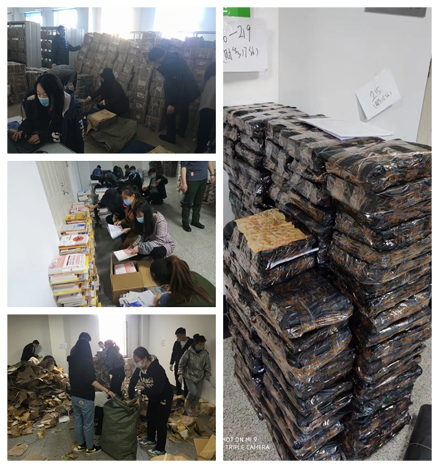 本学期3个年级学生使用到的各类纸质教材240余种3万余册。蒋春艳副院长亲临教材邮寄现场对教材邮寄工作的精准性、时效性等提出具体要求。教务处带领全校12个部门的40位教工,按照图书分类标准,不辞辛苦,仅28日一天时间,就将教材按系、专业、年级有序地搬运到图书馆一楼。各系辅导员及教师百人,从“讲台使者”摇身变成了“搬运工”“分拣工”,不同专业、不同班级,把教材有条不紊地进行拆包、分拣、打包,快速高效地完成了201720182019级学生4700多套教材的分发任务。各专业班级辅导员对遍布省内外的学生址、电话等信息逐一仔细核对,确保教材资料能顺利寄送学生手上同时在各班级群公布教材资料发放清单信息便学生核对收到的教材。