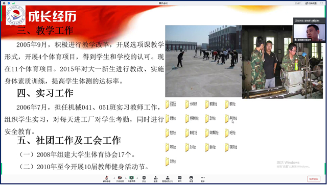 6月11日下午,基础部在线组织部门第一故事分享活动,“部门发展历程团队”推选教师代表杨忠林“教学科研与改革团队”推选教师代表于壮分别做故事分享,副主任张洪岩主持活动分享个人成长故事蒋春艳副院长参加故事会并做点评。