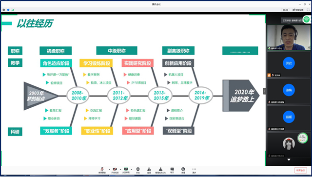 于壮老师“以梦为马、不负韶华“的故事中,结合自己从教17年、来校工作12年的亲身经历,分享了自己教学、科研、职称评定中发生的故事,以2003年为“梦的起点”,畅谈2020年追梦在路上。他将自己的教学工作划分为角色适应阶段、学习锻炼阶段、实践研究阶段和创新应用阶段,讲述了自己通过不断学习实践,逐步为素质全面的“万能教”,且能够不断创新项目;自己的科研工作划分为“双服务”阶段、“职业性”阶段、“应用型”阶段、“双创型”阶段,讲述了紧跟学校教改步伐及时总结教学成果,积极进行教学科研,从参与教改到登上国家级讲台的故事,表示要进一步总结提升教学改革成果,带新人、育新人,助力体育教师团队建设。