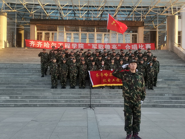 10月14日早6时,由学生工作处主办、建筑工程系承办的2020级新生“军歌嘹亮”合唱比赛在校园明德广场举行。