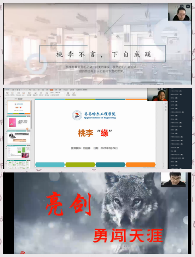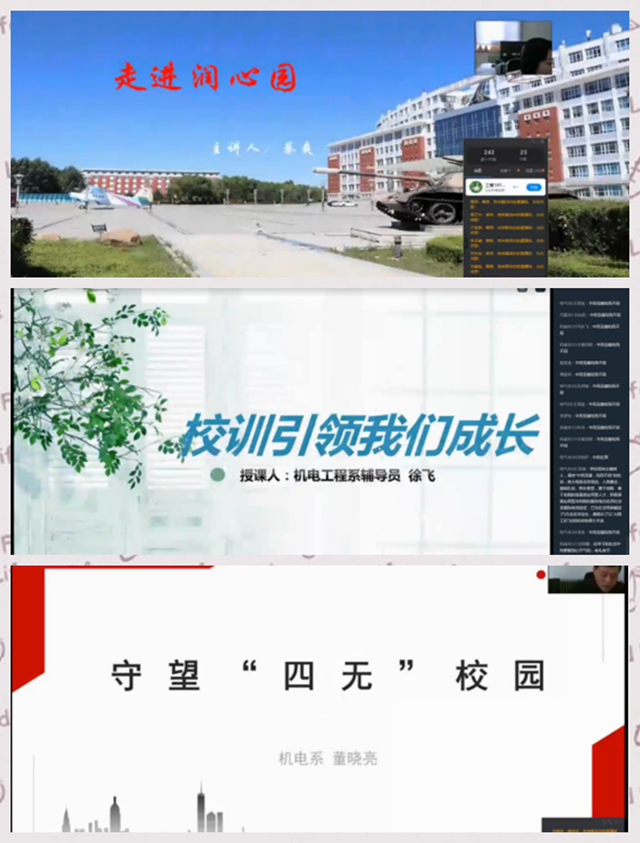 九位主讲辅导员同时开启钉钉直播,分别从九个不同的角度进行分享,学生根据自己的兴趣有选择性地听课。张雷蕾老师以“桃李不言,下自成蹊”为题,刘丽娜老师从桃李“缘”切入,任鹏飞老师分享“亮剑——勇闯天涯”主题。
