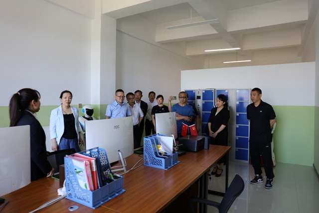 姜岩主席一行在讷河市总工会副主席王金生及讷河市职教中心学校党总支副书记赵占东、学校工会主席杨旭田等校领导的陪同下,参观了讷河市职教中心产教融合实训大楼,在玛瑙玉石雕刻室、电竞实训室、无人机装配室、无土栽培实训室、艺术设计实训室、电商平台实训室、酒店管理实训室等实训基地,现场听取了相关情况介绍。