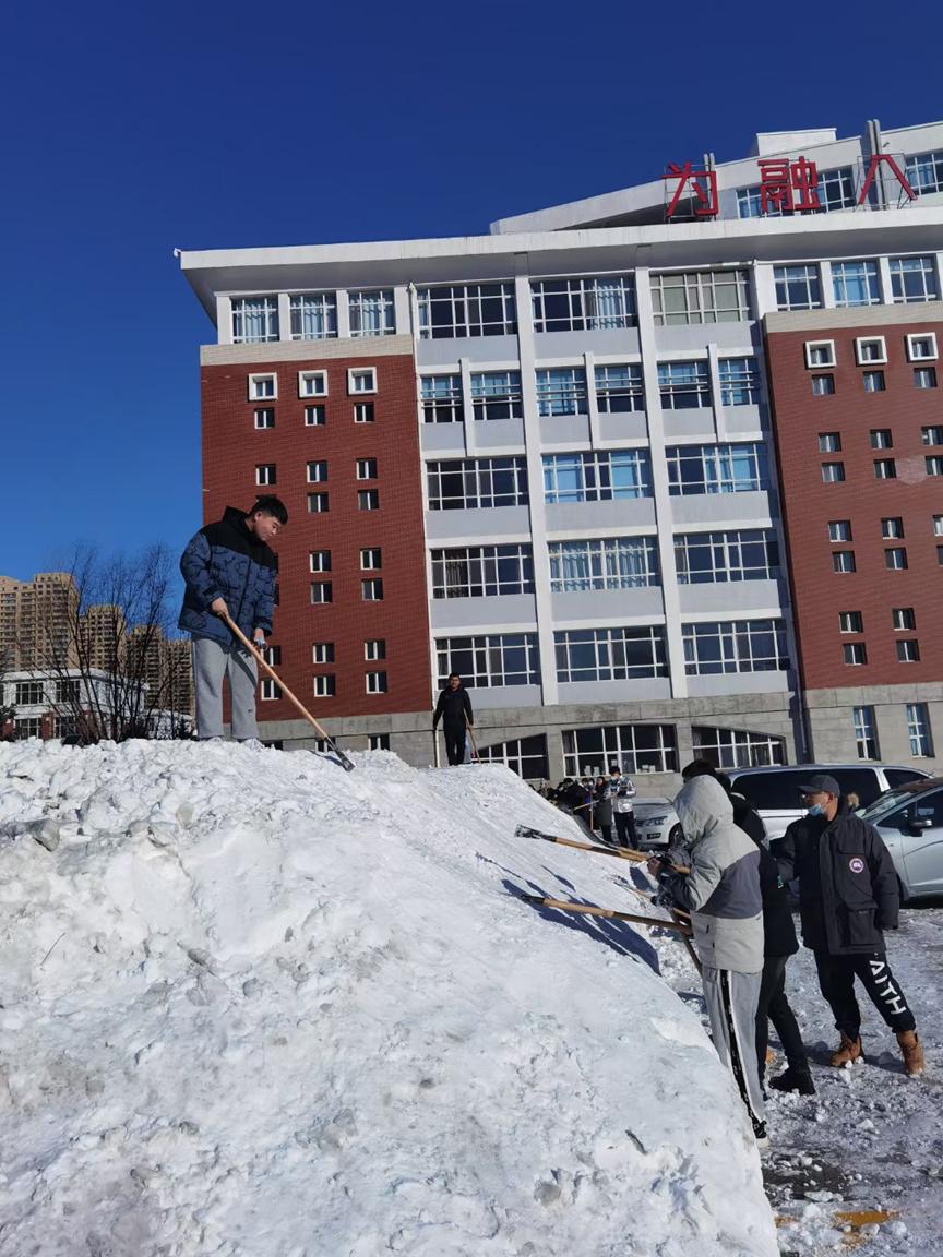 12日上午,同学们带齐工具,将明德广场东西两侧的积雪修平。尽管寒风中同学们的脸和手冻得发红,但手中的工具却没有停下,经过同学们相互配合、齐心协力,雪景基座修得整整齐齐,初具雏形。