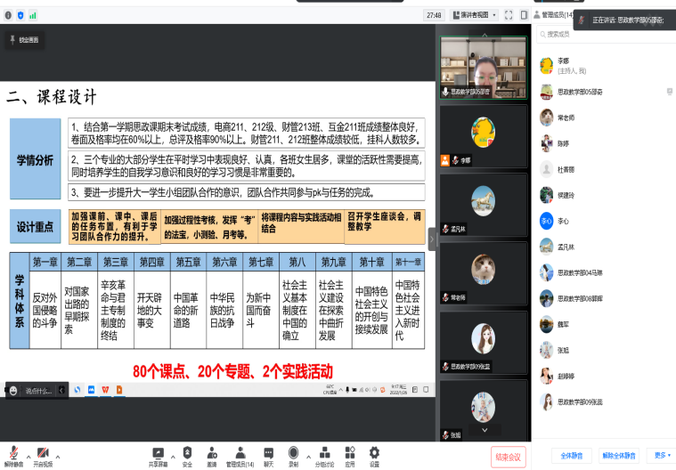 下学期任教《毛泽东思想和中国特色社会主义理论体系概论》和《中国近现代史纲要》两门课程的10位内聘教师分别从课程定位、课程设计、课程实施、课程评价四个要素阐述了课程建设内容,其中《毛泽东思想和中国特色社会主义理论体系概论》课程将实践课项目设置于第四学期,结合专业社会实践开展项目活动。教师们能够结合所任教专业、学情进行设计,发挥学习手册在课前、课中和课后的作用,并注重预习环节的设置。副主任李娜对教师说课进行了逐一点评,要求下学期的课程建设要融入思创融合理念,鼓励教师结合专业深入挖掘教学内容,充分发挥思政课显现教学目标的育人作用。