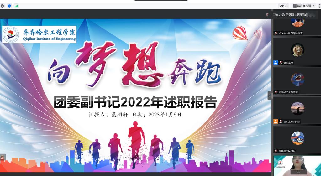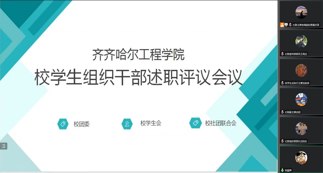 为深入贯彻落实高校学生组织深化改革的要求,完善我校各级学生组织工作,总结2022—2023学年度第一学期校学生组织干部工作经验,1月9日晚,学校在线召开校级学生组织干部述职评议会,副院长张振笋、团委书记郭明敬、团委指导教师张云惠、王睿及校组织学生干部参加,会议由校学生社团联合会副主席由玥主持。