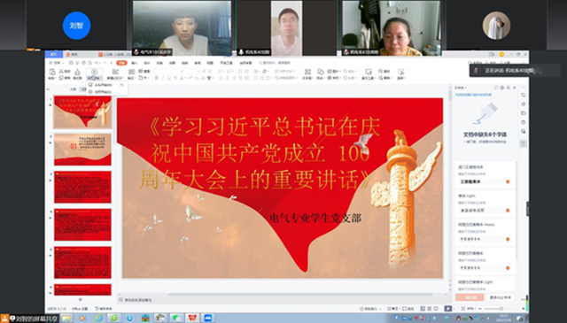 为深入学习建党一百周年习总书记重要讲话精神,7月25日电气专业学生党支部由支部书记刘智老师主持,通过腾讯会议平台采取线上的形式学习建党一百周年习总书记重要讲话,电气专业学生党支部全体党员参会。 刘智老师说...