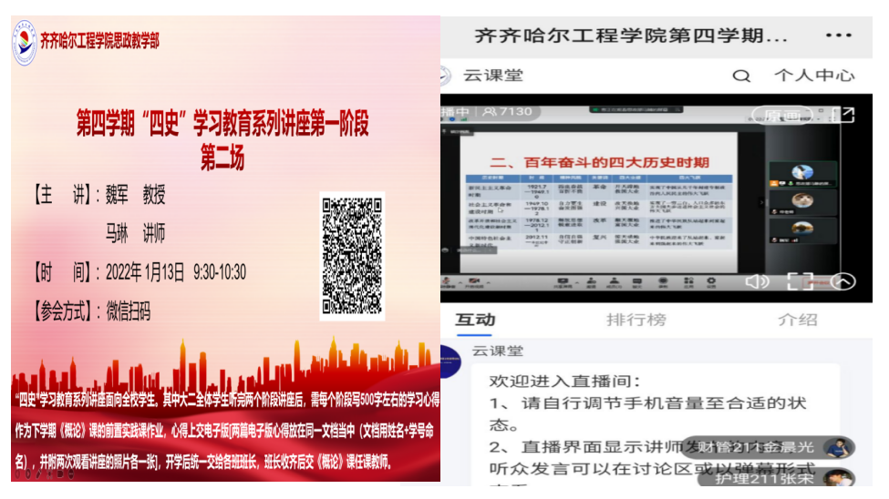 1月13日,思政教学部根据《伟德体育官网2021—2022学年度第四学期实施方案》安排,面向学校全体学生开展了线上“四史”学习教育系列讲座(第一阶段),在线观看人数达到7000余人。 本次讲座由思政教学部魏军、马...