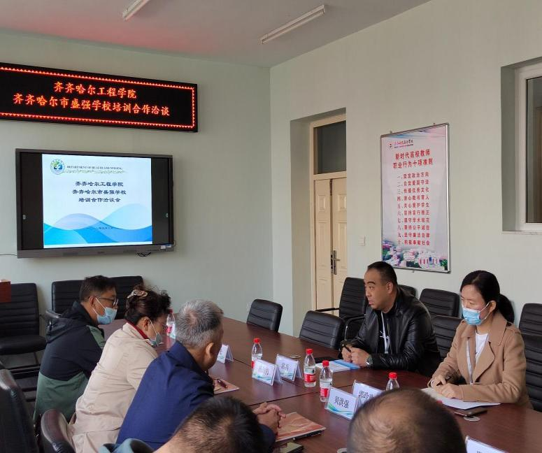 5月3日上午,机电工程系、健康与护理系与齐齐哈尔市盛强学校代表在一号教学区1204教室召开培训合作洽谈会。机电系主任郭磊、健康与护理系负责人郭玲玲,以及培训学校副校长贝洪强、杨淑梅等参加洽谈。 会上,郭玲玲...