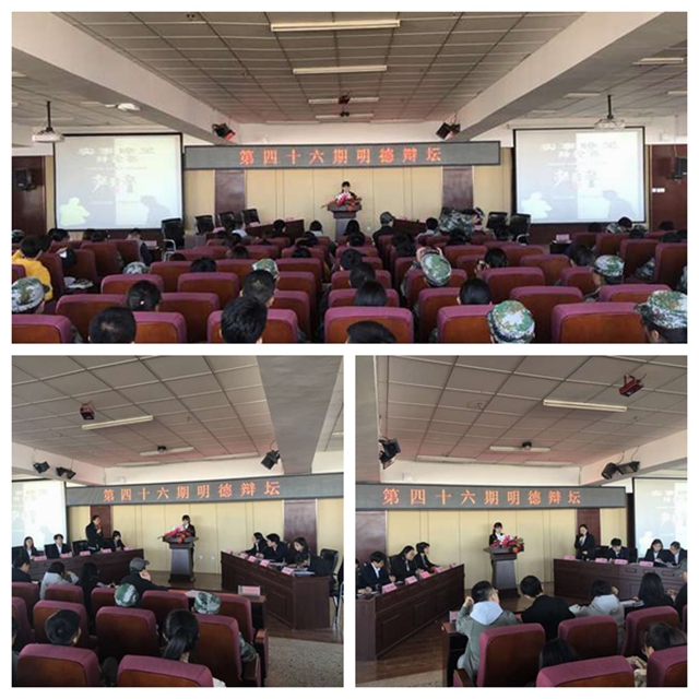 9月18日中午,由学院团委主办、学生民主管理委员会承办的第四十六期“明德辩坛”辩论赛在图书馆501报告厅举行,来自各系学生代表近300人观看比赛。 本期辩论赛,正方代表队由机械本184班古明然、营销181班刘莹莹、营...