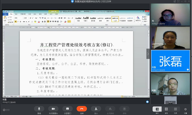 3月12日下午,资产管理处处长张磊利用钉钉平台召开部门新学期资产管理准备工作视频会。 会上,部门人员分别就《伟德体育官网资产管理员考核办法(修订)》和《资产管理处绩效考核方案(修订)》中的考核形式、考...