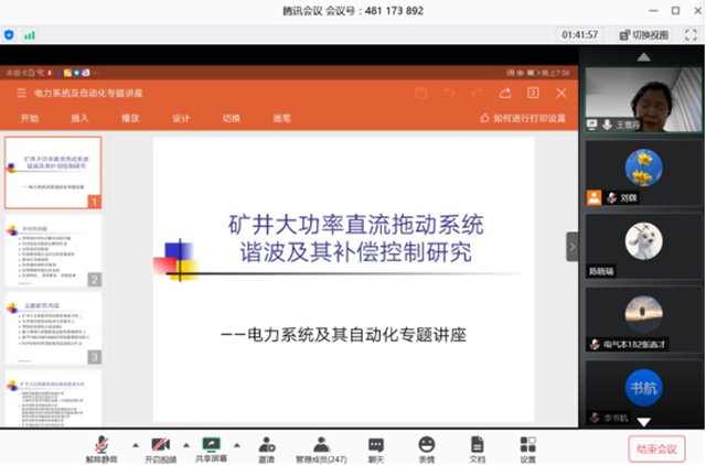 为提高学生对专业的认识,增强学生学习兴趣,5月15日晚,电气专业在腾讯会议平台举办电力系统及其自动化专题讲座。 电气专业学科带头人王雪丹教授为电气专业2017级、2018级、2019级学生主讲了“矿井大功率直流拖动系...